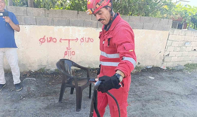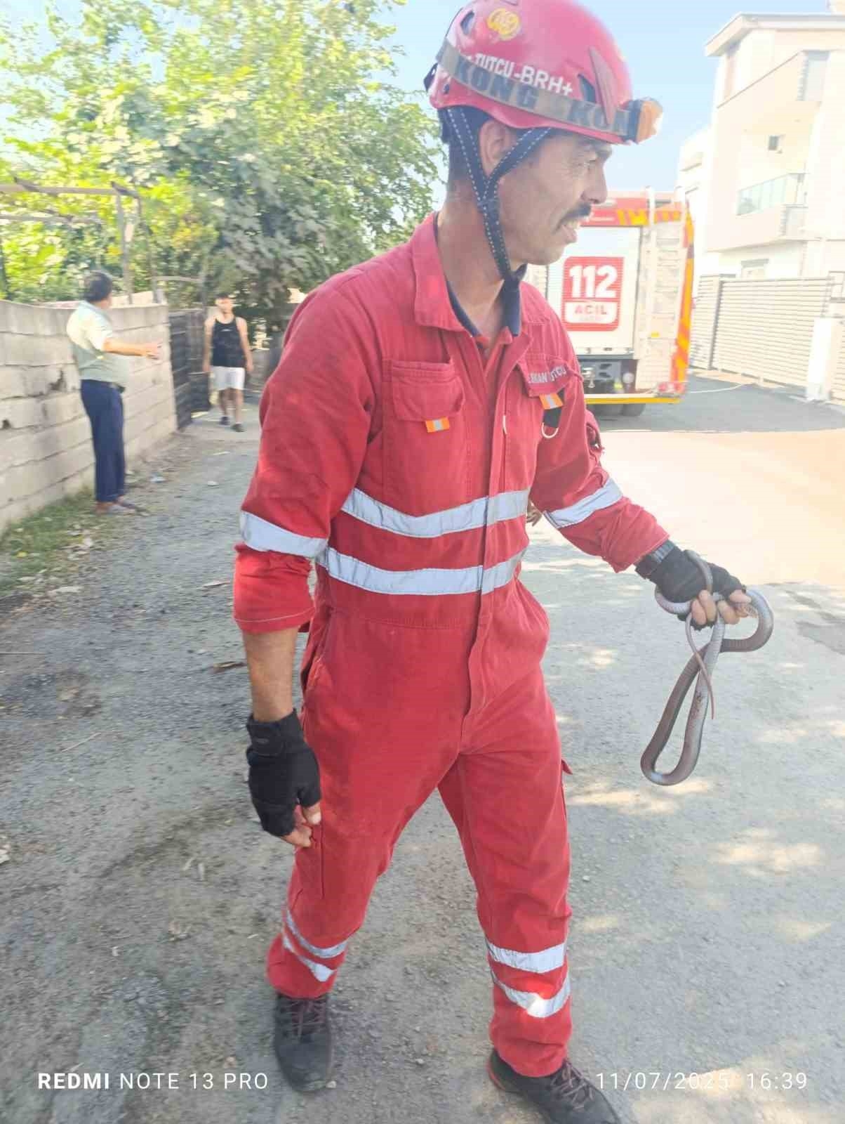 Hatay'ın Dörtyol ilçesi Özerli Mahallesi'nde bir eve giren yılan, itfaiye ekiplerinin müdahalesiyle yakalanarak doğal yaşam alanına bırakıldı.