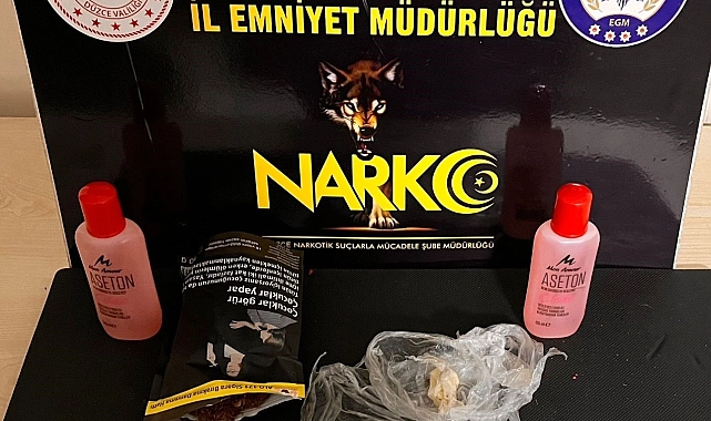 Düzce Cumhuriyet Başsavcılığı koordinesinde Narkotik Suçlarla Mücadele Şube Müdürlüğü ekiplerince 2 şahsa yönelik yapılan operasyonda, 10 gram ADB Butinica (1 kilogram Bonzai yapabilecek uyuşturucu hammaddesi), uyuşturucu madde imalinde kullanılacağı değerlendirilen tütün ve aseton ele geçirildi.