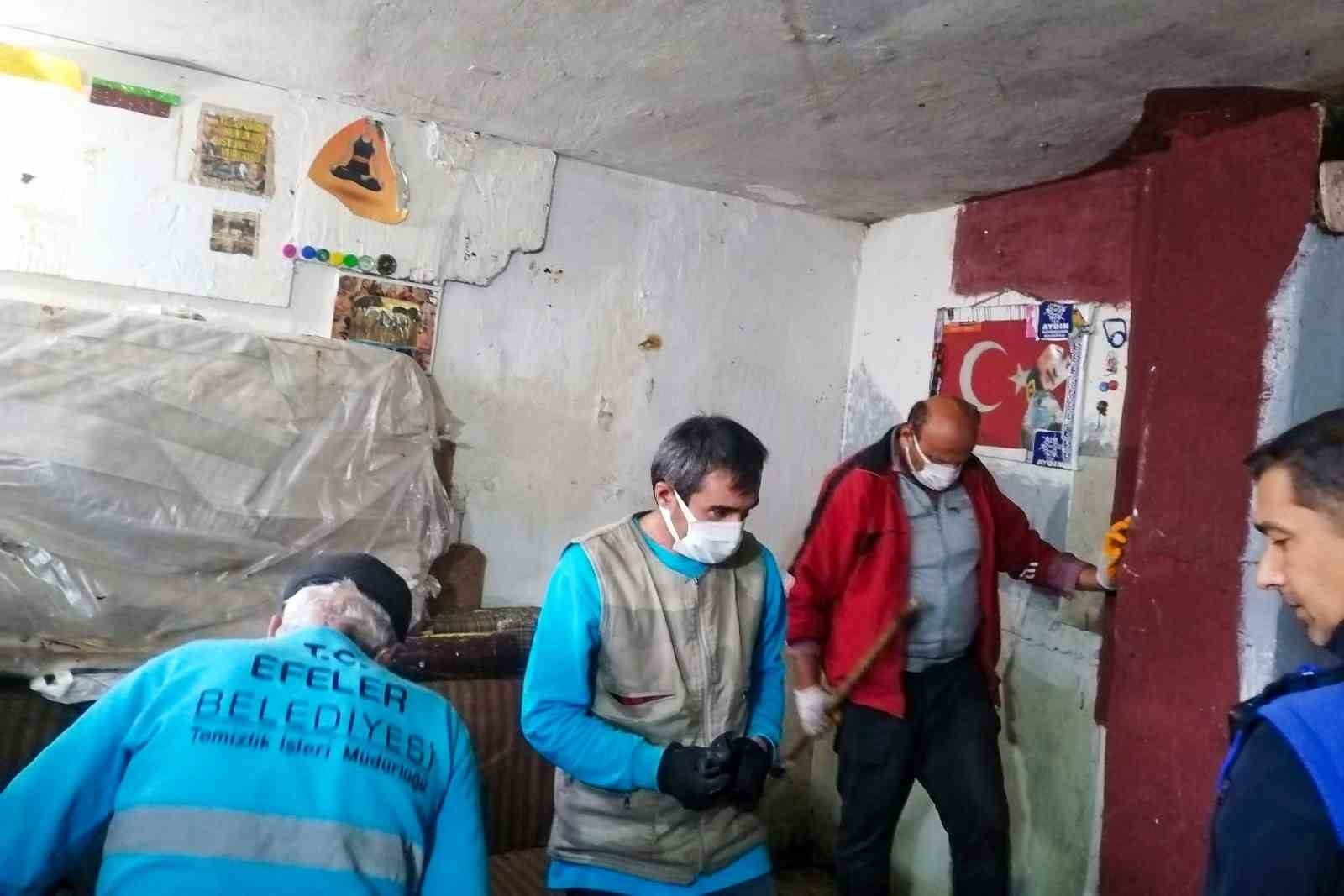 Aydın'ın Efeler ilçesinde belediye ekiplerince tespit edilen çöp evden 2 kamyon çöp çıkarılırken, ev dezenfekte edildi.