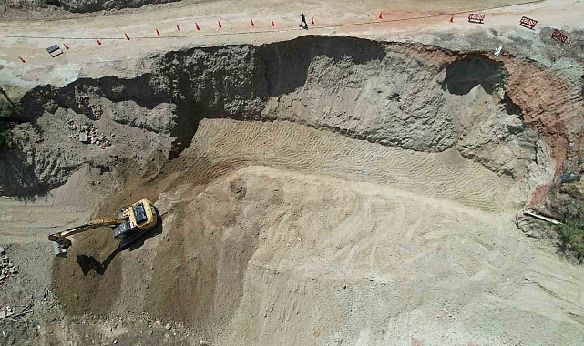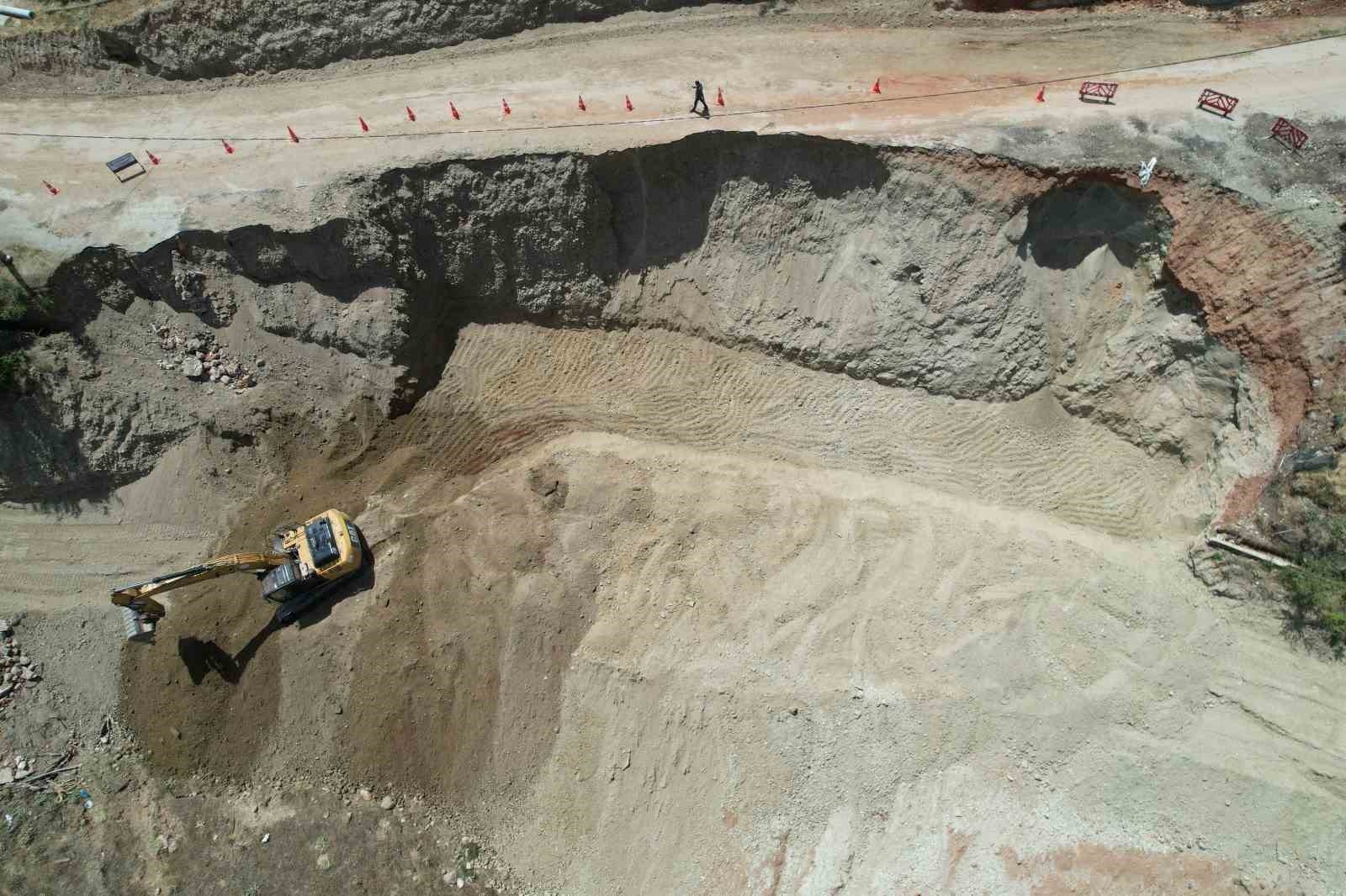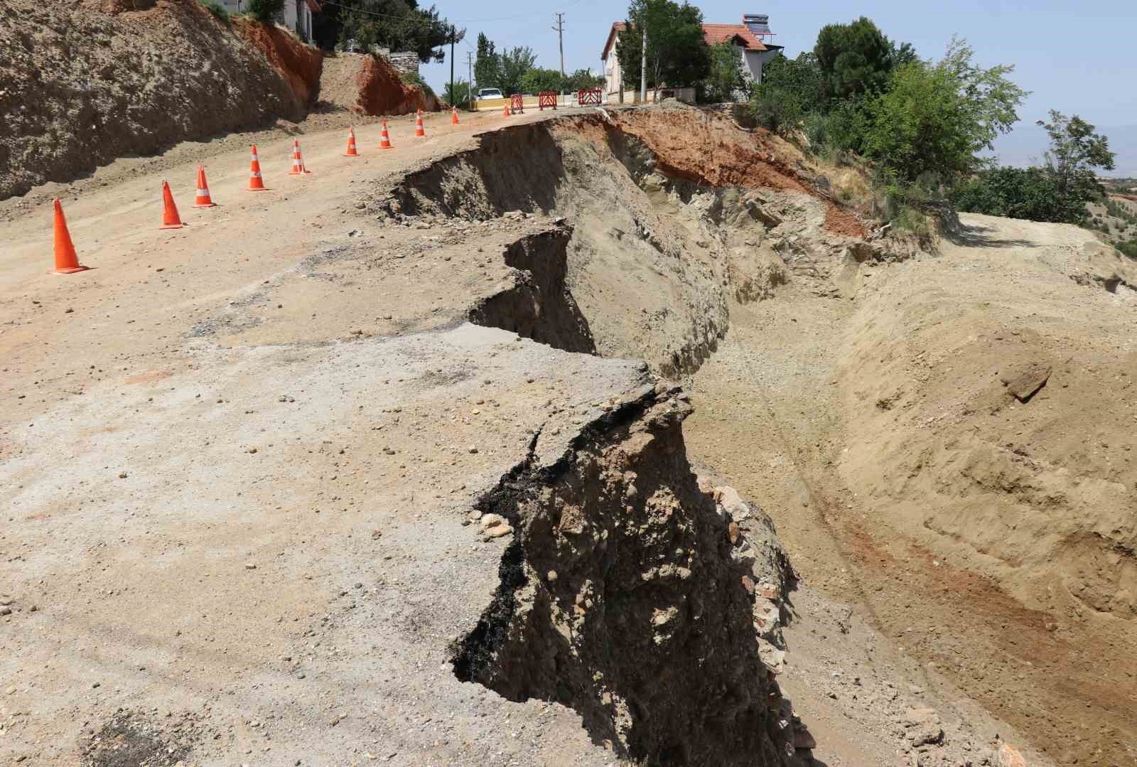 Denizli'de toprak kayması sonucu bir kısmı çöken yolda Büyükşehir Belediyesi ekiplerinin çalışmaları sürüyor.