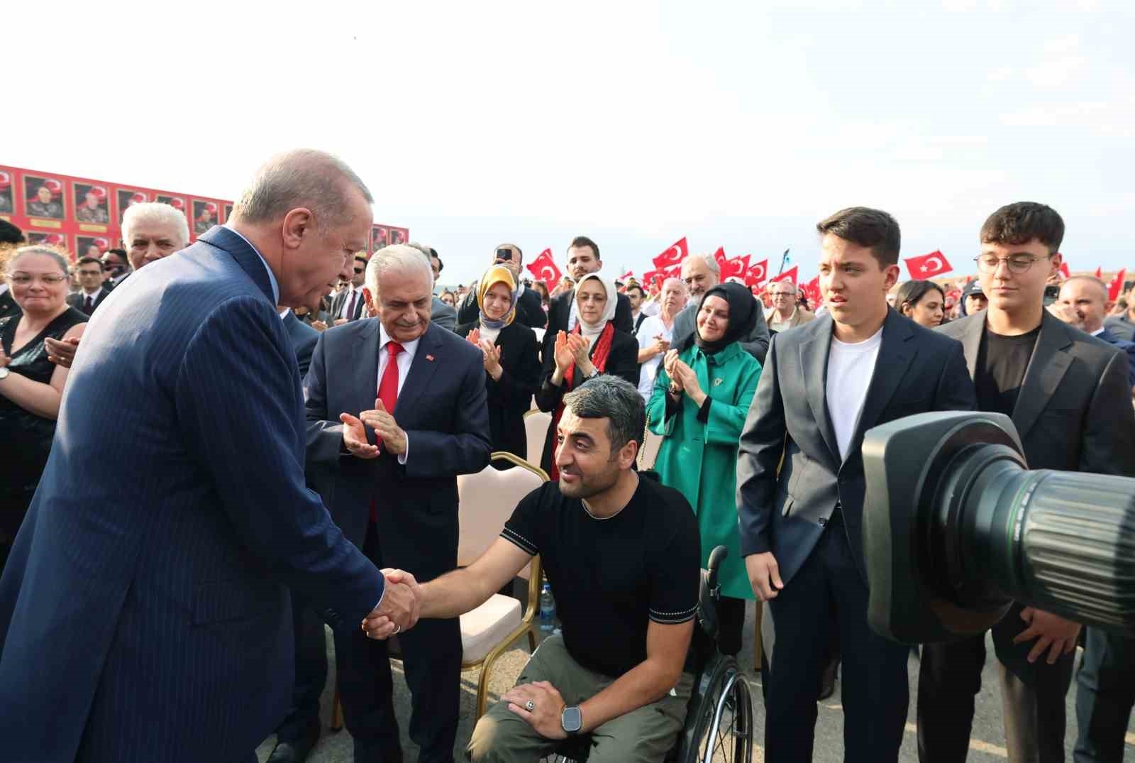 "Şunu herkesin özellikle de şehit yakınlarımızın bilmesini isterim. Milletin kendilerine emanet ettiği silahlarla bu kardeşlerimizi ailelerinden ve bizden koparan FETÖ'cü alçaklar, ne yaparlarsa yapsınlar, sonsuza kadar lanetle, nefretle hatırlanacaklar " diyen Erdoğan, "Şehitlerimiz ise daima hayırla yad edilecek. Bu milletin gönlünde ayrı bir yer tutacak, dua ile, minnet ile, rahmet ile anılacaklar. Şehit ve gazilerimize olan vefa borcumuzu hiçbir zaman unutmayacak, genç nesillerin de daima hatırlamasını sağlayacağız. Örgütten gelen en büyük tehditleri en büyük taarruzları başarıyla atlattık" ifadelerini kullandı.