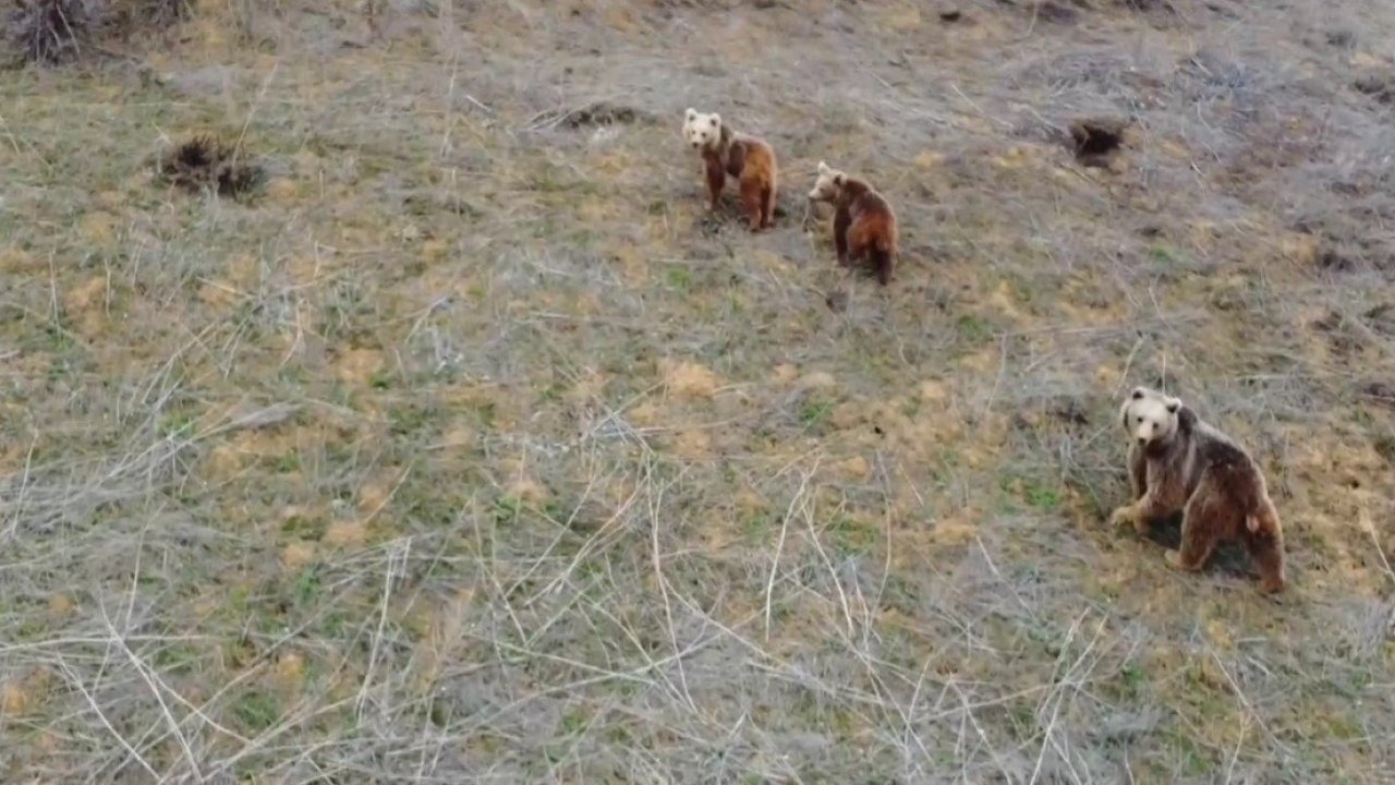 Erzincan'ın Refahiye ilçesine bağlı Orçul kırsalında, yiyecek arayan bir boz ayı ve iki yavrusu, drone kamerasıyla havadan görüntülendi. Görüntülerde, anne ayının yavrularıyla birlikte arazide dolaştığı anlar yer aldı.