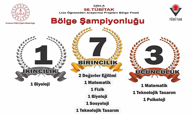 Erzurumlu öğrenciler, TÜBİTAK 2204-A 56. Lise Öğrencileri Araştırma Projeleri Yarışması'nda elde ettikleri büyük başarıyla Trabzon Bölge Finali'ne adeta "Erzurum" mührünü vurdu. Biyoloji, Kimya, Tarih, Coğrafya, Matematik, Türk Dili ve Edebiyatı, Değerler Eğitimi, Sosyoloji, Teknolojik Tasarım, Fizik, Psikoloji ve Yazılım gibi geniş bir yelpazede hazırladıkları özgün projelerle yarışan Erzurumlu lise öğrencileri, jüri tarafından yapılan değerlendirmeler sonucunda 7 birincilik, 1 ikincilik ve 3 üçüncülük elde ederek büyük bir başarıya imza attılar.