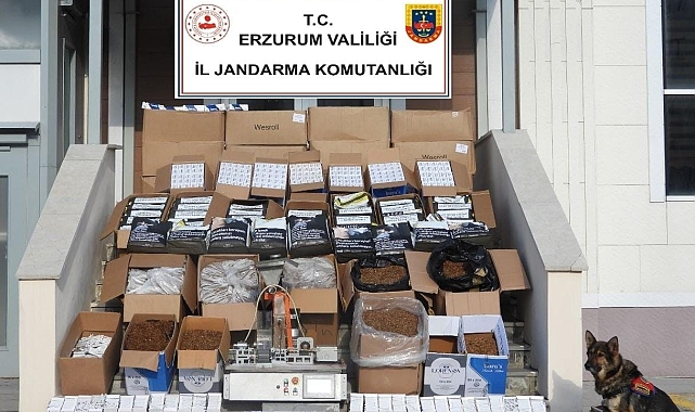 Erzurum İl Jandarma Komutanlığı ve İl Emniyet Müdürlüğü tarafından 23 Eylül 2024 günü Yakutiye ilçe merkezinde 3 şahsa ait imalathanede yapılan müşterek aramada; 5 bin 750 paket kaçak sigara, 428 bin 541 adet boş makaron, 222 bin 547 adet içi tütünle doldurulmuş makaron, bin 453 kg. kaçak tütün, 55 bin 159 adet sigara sarma kağıdı, 55 bin 340 adet sigara filtresi, 652 adet kesilerek toplanmış bandrol ve 1 adet sigara dolum makinesi ele geçirildi.