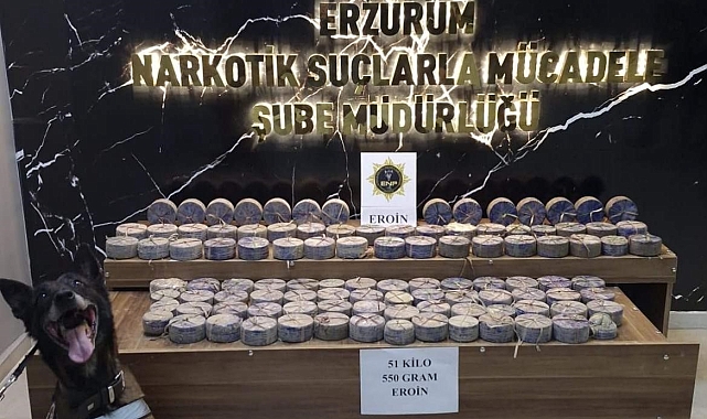 Erzurum Emniyet Müdürlüğü Narkotik Suçlarla Mücadele Şube Müdürlüğü ve İstihbarat Şube Müdürlüğü görevlilerimizce il genelinde uyuşturucu madde konularına yönelik Narkotik Madde Arama Köpeği Magnum ve Hera ile yapılan kontroller neticesinde; 51 kilogram 550 gram eroin maddesi ele geçirildi.