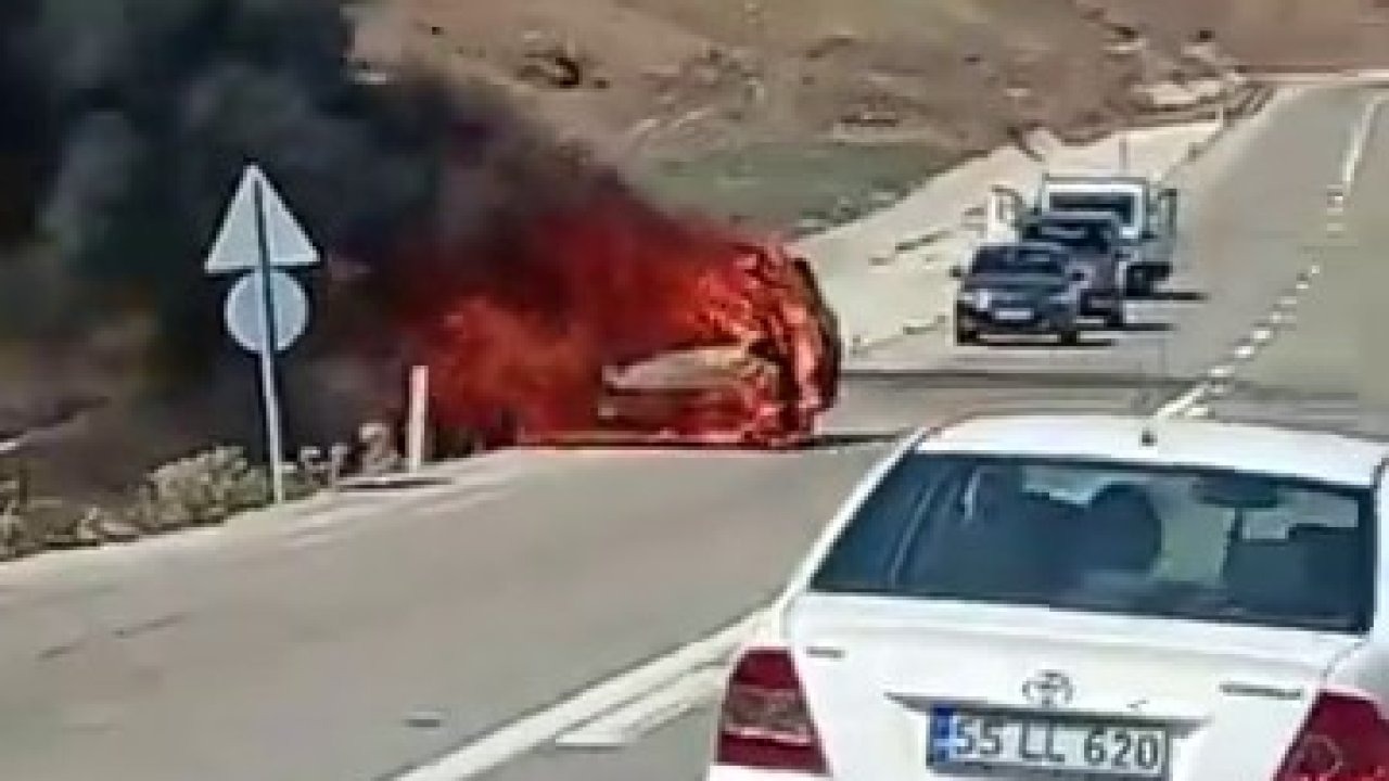 İHA'nın haberine göre Yoldan geçen sürücülerin cep telefonu kameralarıyla kaydettiği görüntülerde, aracın kısa sürede alev topuna döndüğü görüldü.
