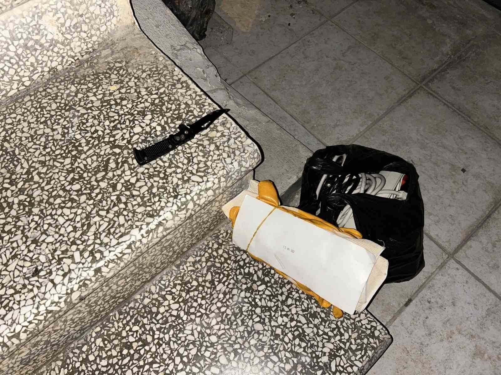 Şahıstan geriye kalan bıçak, eldiven ve içinde kablo olan poşet polis ekipleri tarafından teslim alındı.