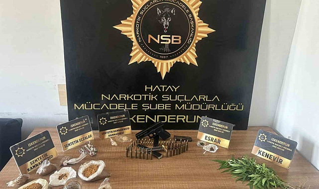 Hatay Emniyet Müdürlüğü ekipleri, uyuşturucu imal ve ticaretine yönelik çalışmalarını aralıksız sürdürüyor. Bu çalışmalar çerçevesinde 11 Temmuz tarihinde İskenderun ilçesinde 6 şüphelinin evlerine operasyon düzenlendi. Şüphelilerin evinde yapılan aramada; D.E.'nin evinde 17 galara, 2,63 gram esrar maddesi; şüpheli H.E.'nin evinde 4 hint keneviri; şüpheli S.E.'nin evinde 2 parça halinde 9,50 gram A-M, 5 parça halinde 241 gram sentetik kannabinoid, 1 parça 4,50 takoz esrar, 7,65 tabanca, 1 şarjör, 12 fişek ve 1 bıçak ele geçirildi. Ayrıca şüpheliler S.B. ve S.B. evlerinde ise 22.70 gram sentetik kannabinoid maddesi bulunurken S.B.'nin kadına karşı şiddet suçundan arandığı tespit edildi. Şüpheli M.T.'nin evinde yapılan aramada; 157,62 mm kalaşnikof fişeği, 17 9 mm tabanca fişeği ve 1 tabanca şarjörü ele geçirildi.