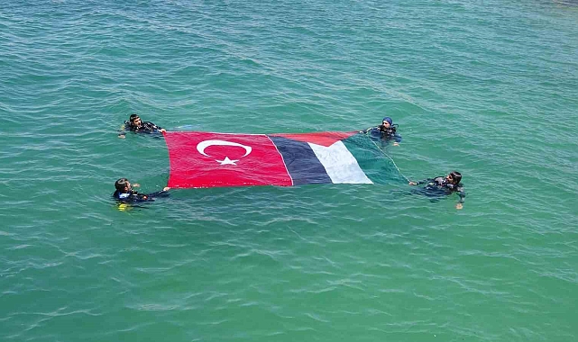 Sualtı Arama Kurtarma Eğitim Derneği (AKEM) üyeleri, Filistin'e destek olmak ve saldırıları kınamak amacıyla Van Gölü'nün yüzeyinde Türk ve Filistin bayrağı açtı.