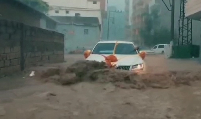 Şırnak'ın Cizre ilçesinde dün etkili olan sağanak, kentte hasara yol açtı. Sel sırasında bir gelin arabası suların ortasında kalırken, su seviyesinin yükselmesiyle sürücü aracıyla ilerleyip kurtulmaya çalıştı.