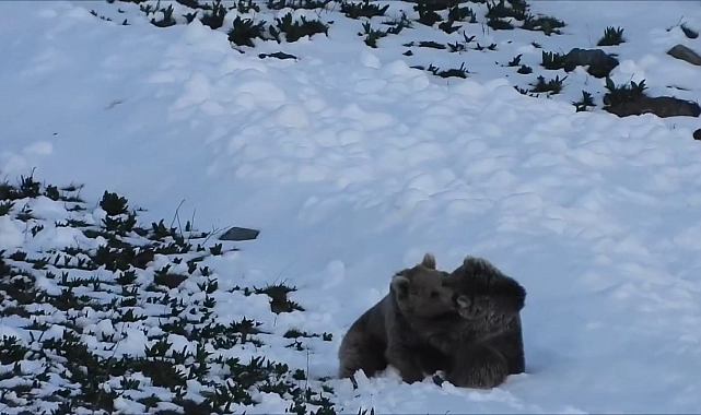 Arazide bir süre yiyecek arayan ayılar daha sonra karlı zemin üzerinde koşturdu, sonra kar üzerinde yuvarlanmaya başladı. Güreşen ayıların görüntüsü gülümsetti.
