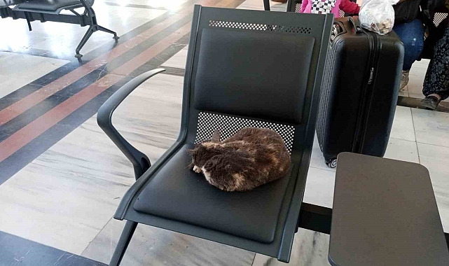 Eskişehir'de dışarıdaki sokak gürültüsünden kaçarak tren garında yattığı oturağın üzerinde derin bir uyku çeken sevimli kedi görenleri gülümsetti.