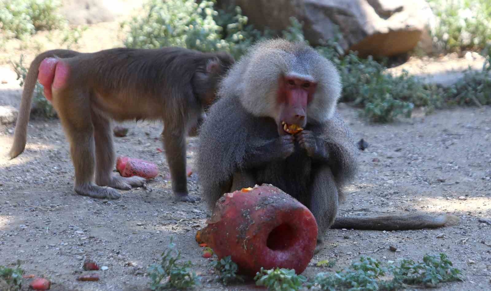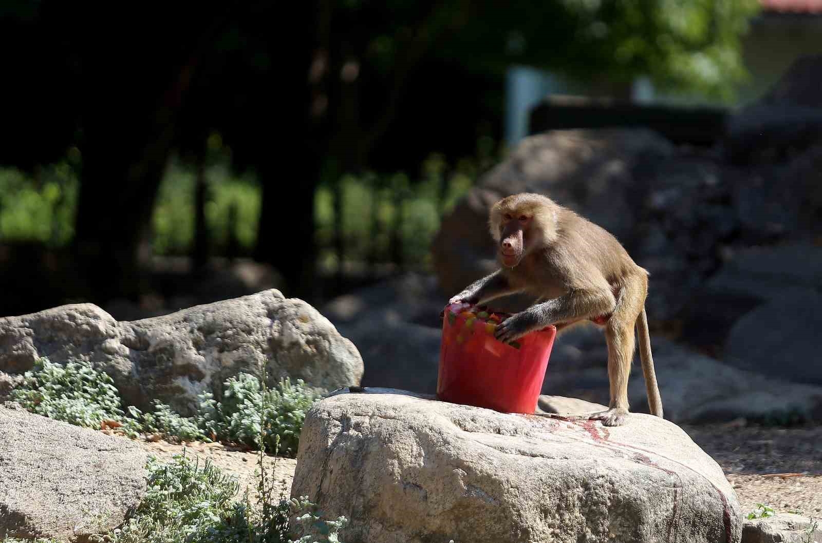 Bursa Hayvanat Bahçesi'ndeki veteriner ekipleri, Dünya Dondurma Günü dolayısıyla Habeş Maymunlarına meyveli dondurma hazırladı. Maymunların hastalık riski nedeniyle endüstriyel üretim dondurmaların sakıncalı olduğunu ifade eden veterinerler, beslenme programlarına uygun doğal meyvelerden oluşan dondurmaları özenle hazırladıklarını belirtti. Hava sıcaklıkları 35 derecelere ulaşırken, maymunlar sıcak havada buz gibi meyveli dondurmanın keyfini çıkartmak için adeta birbirleri ile yarıştı. Hayvanat bahçesini ziyaret eden çocuklar ise ilk kez dondurma yiyen maymunları görmenin şaşkınlığını yaşadı.