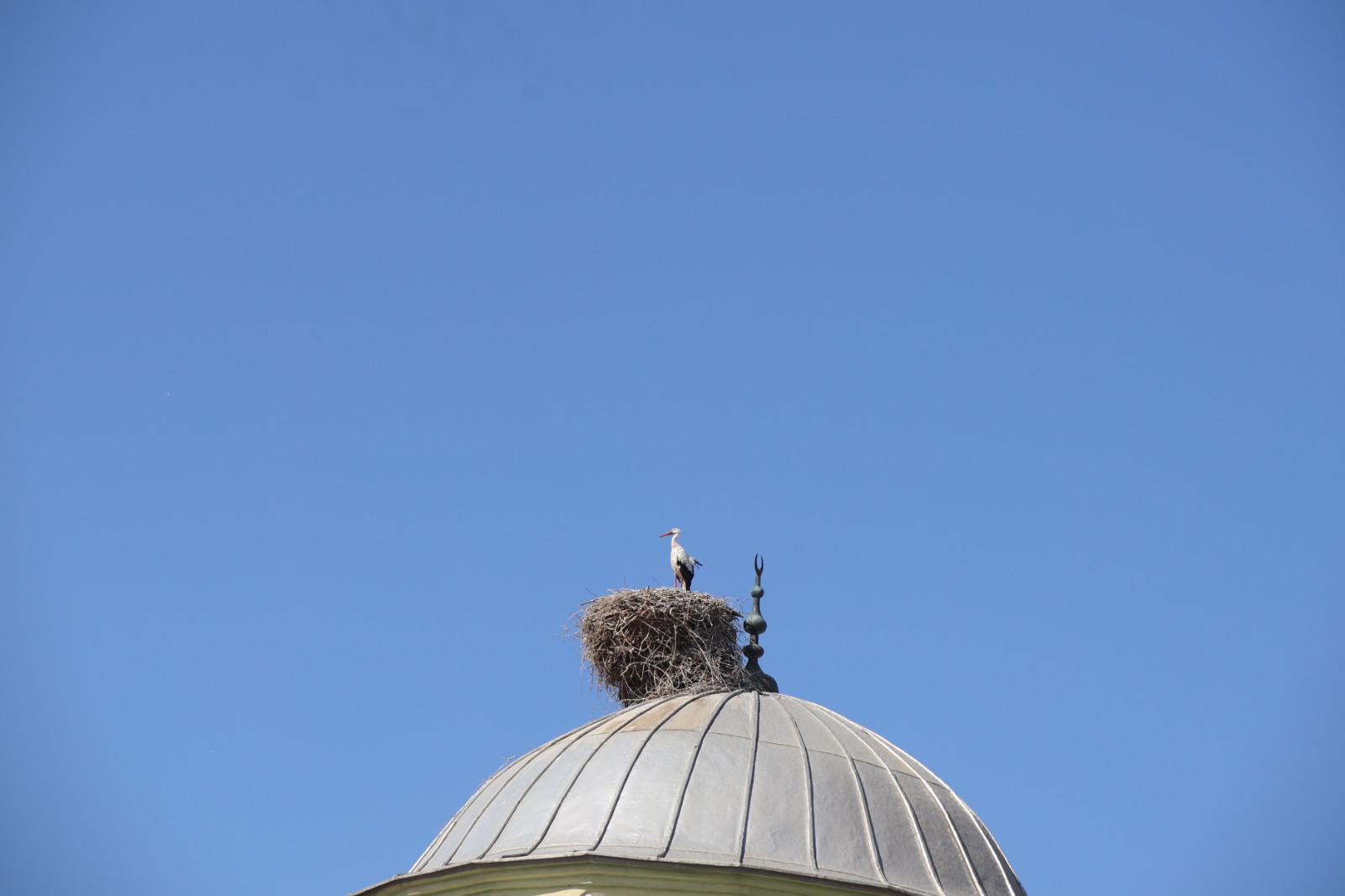 Hacı Hacer Camii’nin kubbesinde yuvasını yapan leylek, objektiflere böyle yansıdı.