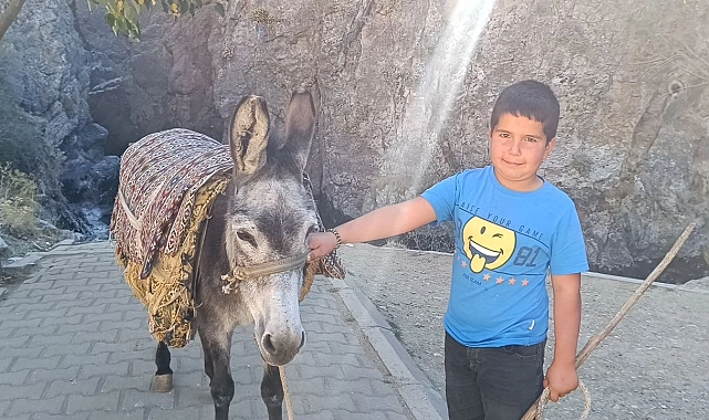 Kayseri'nin Develi ilçesinde 9 yaşındaki Musa; Homurlu Şelalesi'ne gelen misafirleri eşekle gezdirerek okul harçlığını çıkartıyor.
