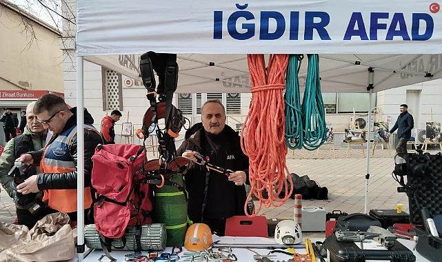 6 Şubat depreminin yıl dönümü dolayısıyla Iğdır İl Afet ve Acil Durum Müdürlüğü (AFAD), Iğdır Merkez Camii önünde bir stant açarak arama kurtarma malzemelerini vatandaşlara tanıttı.