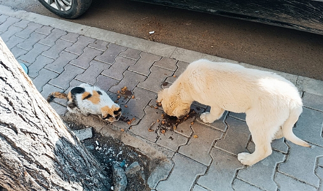 Sokakta uyuyan bir köpeğin yanına sokularak şefkat arayan sevimli kedi, köpeğin sıcak ilgisiyle karşılaştı. İki hayvanın paylaştığı bu samimi anlar, adeta bir dostluğun simgesi oldu. Bir hayvanseverin verdiği yaş mamayı birlikte yiyen kedi ve köpek, daha sonra oyun oynamaya başladı. Günün büyük bir bölümünü birlikte geçiren bu iki hayvanın, adeta yedikleri içtikleri ayrı gitmiyor.
