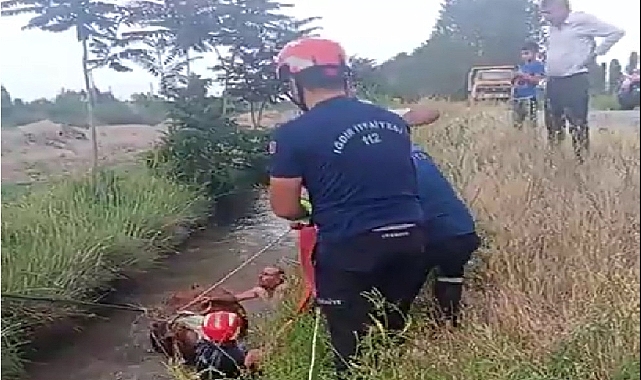 Iğdır'ın Oba köyü ile Alikamerli arasında bulunan sulama kanalına düşen inek Iğdır Belediyesi itfaiye ekiplerinin yoğun çabaları sonucu kurtarıldı.