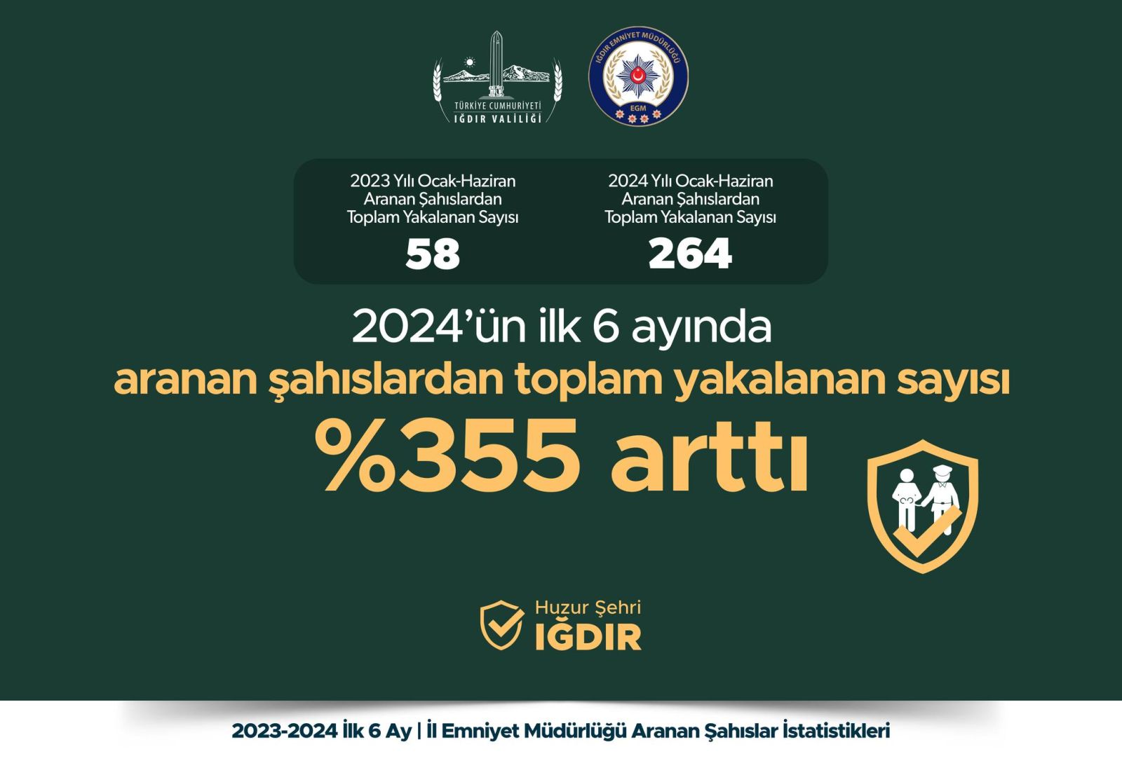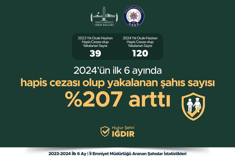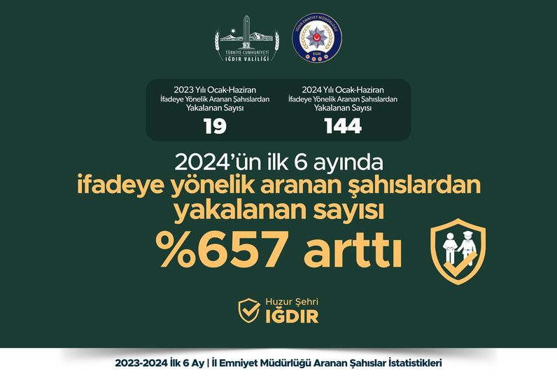 Iğdır İl Emniyet Müdürlüğünün çalışmaları sonucunda 2024 yılının ilk 6 ayında, geçen yılın ilk 6 ayına kıyasla aranan şahısların yakalanmasında önemli bir başarı elde edildi.