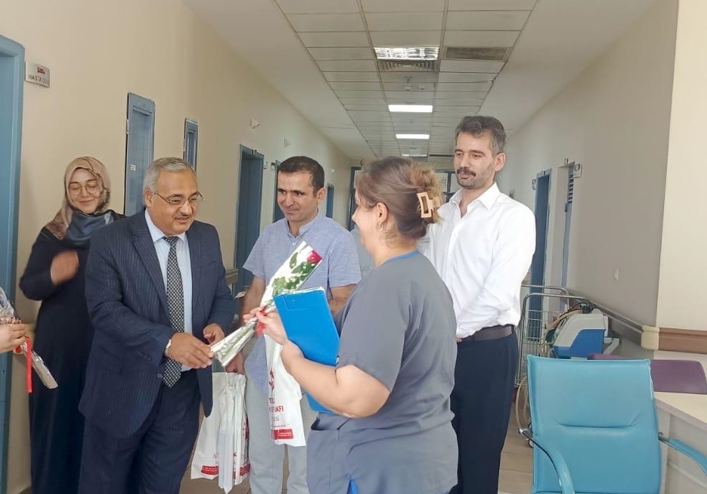 Müftü Demirel, hastane Başhekimi Uzman Dr. Cafer Koçak’ı makamında ziyaret ederek hafta vesilesiyle duyulan manevi atmosferi paylaştı. Ardından servislerde tedavi gören hastaları ziyaret eden Demirel, geçmiş olsun dileklerinde bulunarak hastalara gül takdim etti.