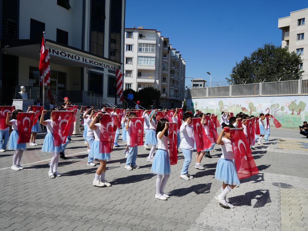 Törende öğrencilerin hazırladığı bayrak gösterisi büyük beğeni toplarken, öğretmenler ve okul yöneticileri de yeni eğitim yılı için öğrencilere başarı dileklerini iletti.