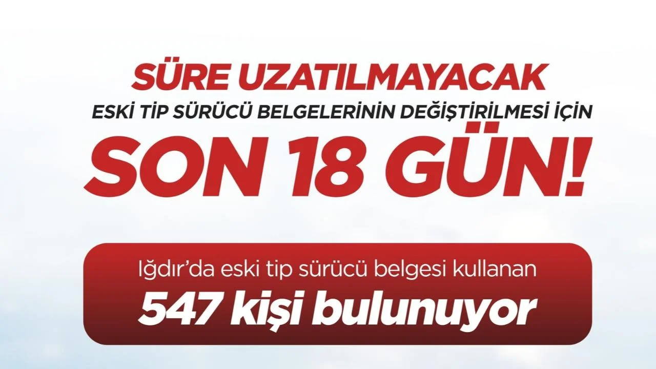 “Iğdır’da şu anda 547 vatandaşımız eski tip sürücü belgesiyle trafiğe çıkıyor. Bu belgelerin yenilenmesi için sadece 18 gün kaldı. Süre uzatılmayacak. Vatandaşlarımızın mağduriyet yaşamamaları adına randevularını e-Devlet üzerinden veya Alo 199 çağrı merkezi aracılığıyla alarak işlemlerini tamamlamaları önem arz ediyor.”