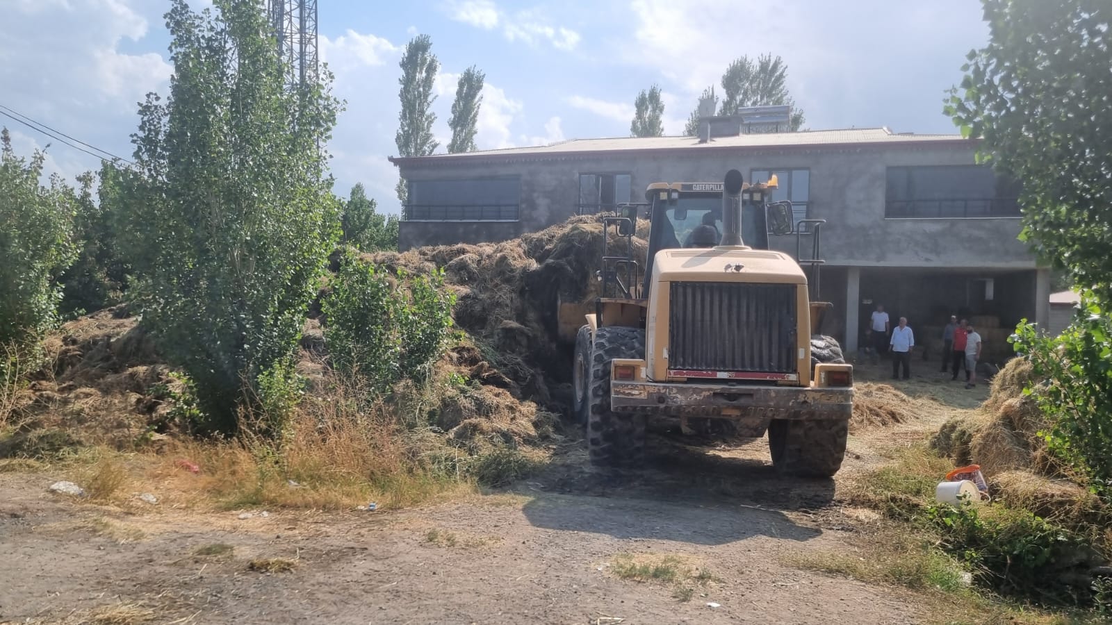 Yangında zarar gören ot balyaları ve enkaz, Iğdır İl Özel İdaresi’ne ait iş makineleriyle kamyonlara yüklenerek açık araziye taşındı.