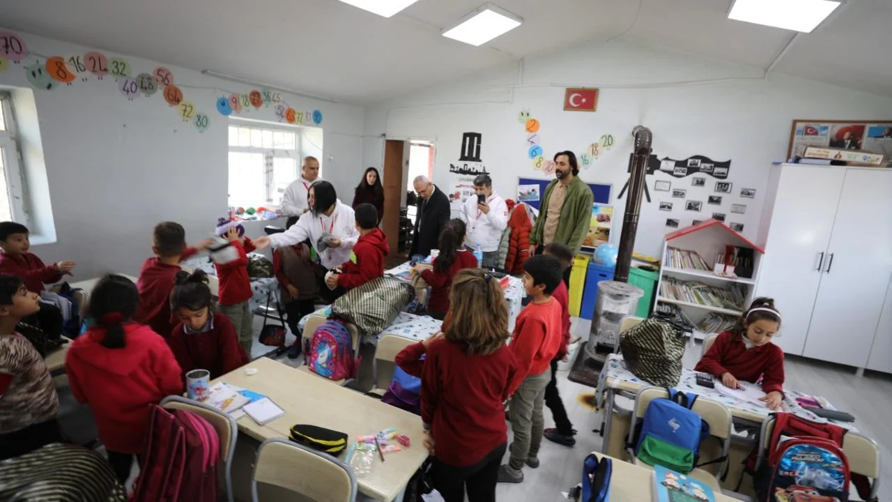 Dernek üyeleri, kentteki 7 köy okulunu gezerek öğrencilerle görüşüp mont ve botları teslim etti.