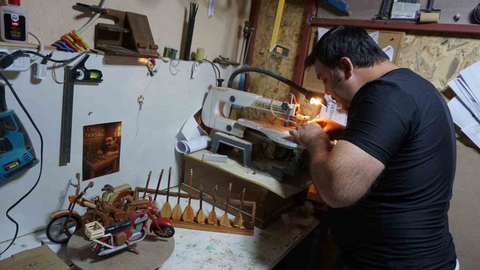 Sanat yolculuğunu ve eserlerine duyduğu sevgiyi anlatan Özel, "Ahşap işleme sanatına yaklaşık 5 yıl önce, tamamen hobi amaçlı başladım. Evin kenarında bulunan 5 metrekarelik bir alanı küçük bir atölyeye dönüştürdüm. İki kalas bir hevesle çıktığım bu yolda, zamanla işler büyüdü ve ortaya birbirinden farklı eserler çıktı. Aklınıza gelebilecek her şeyi ahşaba dökebiliyorum. Özellikle geçmişte kullanılan ulaşım araçlarını, motosikletleri, yöremizde çalınan saz ve cura türü müzik aletlerini minyatür boyutlarda yapıyorum. Ayrıca su kabağını da işleyerek dekoratif objeler haline getiriyorum. Her bir parçayı büyük bir emekle, sabırla hazırlıyorum" dedi. Bu işten maddi bir kazanç elde etmediğini belirten Özel, "Tamamen keyif, merak ve gönül işi olarak yapıyorum. Ahşabın gönle sığmayan güzelliklerini emeğimizle birleştiriyor, kalıcı hatıralara dönüştürüyoruz. Gönüllere sığdıramadığımız güzellikleri, bir anı kalsın diye ahşaba işlemeye devam edeceğiz" şeklinde konuştu.