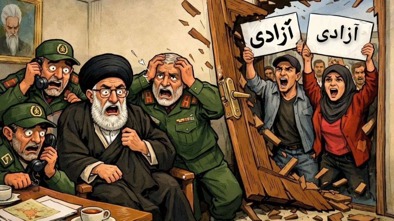 Üçüncü paylaşımda ise protestocuların kapıyı kırarak içeri girdiği sırada İran dini lideri Ayetullah Ali Hameney ve İran Devrim Muhafızları Ordusundan üst düzey liderlerin bir odada saklandığını gösteren karikatüre yer verildi. Paylaşımda, "İsrail için belirledikleri yıkım takvimi şimdi kendileri için belirlenmiş oldu" ifadeleri kullanıldı.