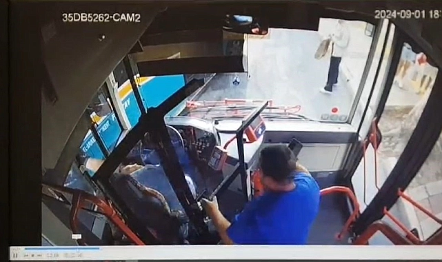İzmir'de bir kadın otobüs sürücüsü, durağa yanaştığı esnada önünü kesen minibüs şoförünün saldırısına uğradı. O anlar otobüs kamerasına yansıdı.