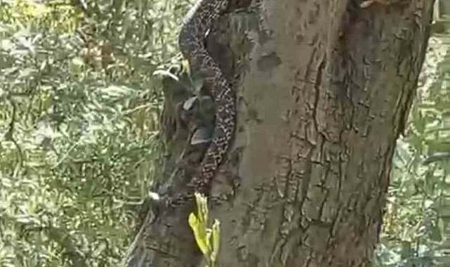 Tarlaya çalışmak için gelenlerin dikkati sayesinde fark edilen yılanın cüssesi, görenlerin içini ürpertti. Zeytin ağacının dalları arasında yavaşça ilerleyen yılan, bir süre sonra gözlerden kayboldu. Yılanın türü ve ağaca neden tırmandığı ise merak konusu oldu.