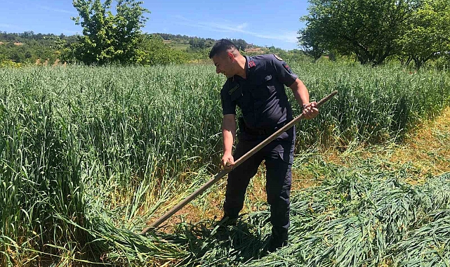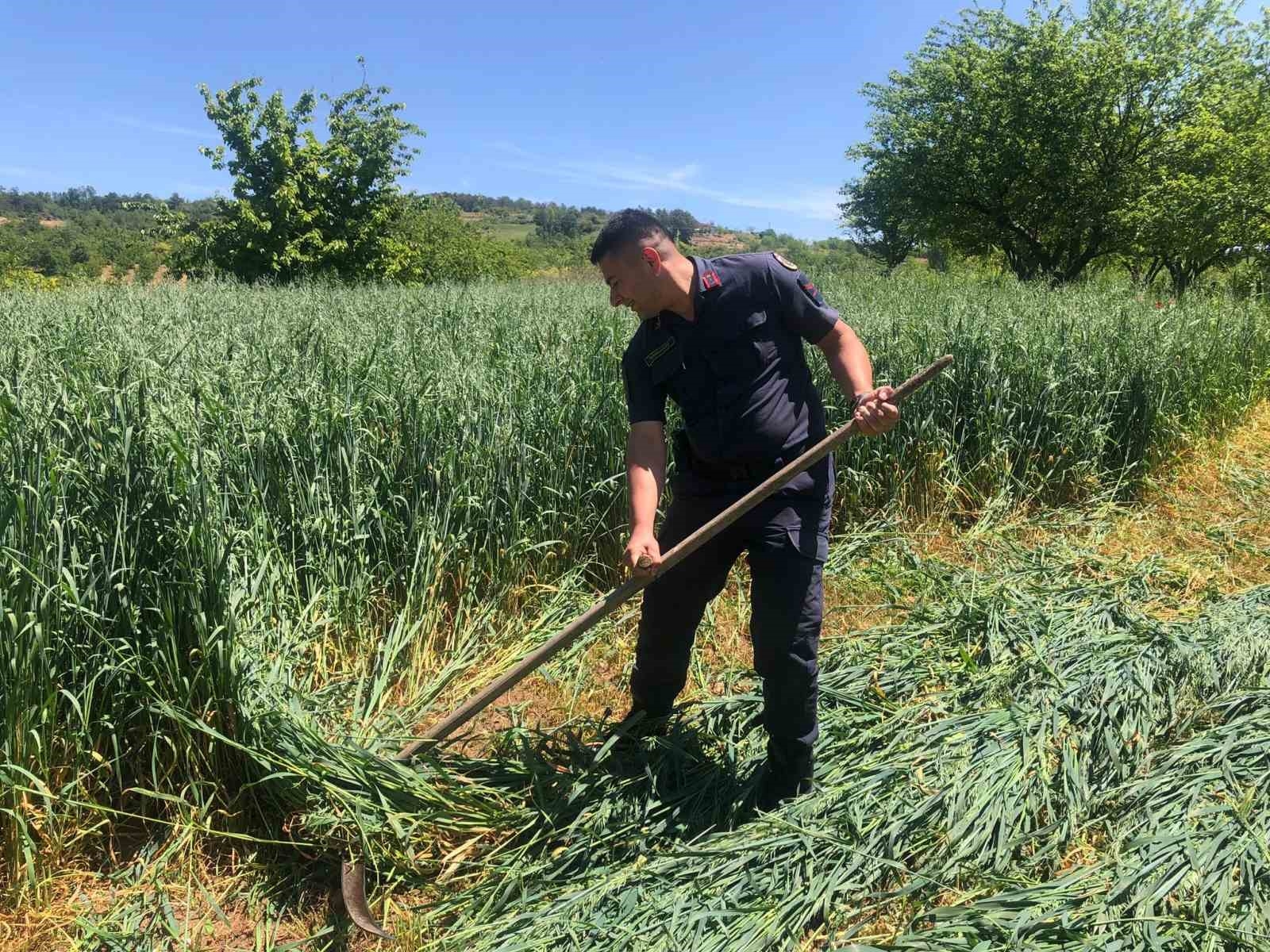 Bilecik'te tarlasında yulaf biçen çiftçi Ömer Seral'ın yorgunluğu gören jandarma eline tırpanı alarak yardım etti.
