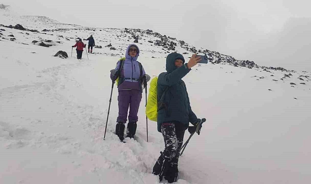 Tur rehberi Cuma Saltık eşliğinde ilerleyen kadın dağcılar, yoğun kar yağışı ve fırtınaya rağmen 4 bin 300 rakımına ulaşmayı başardı.