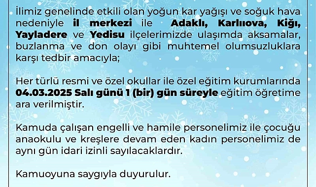 Bingöl'de etkili olan yoğun kar yağışı ve olumsuz hava koşulları nedeniyle, 4 Mart 2025 Salı günü il merkezi ve 5 ilçede eğitime 1 gün süreyle ara verildi. Bingöl Valiliği'nden yapılan açıklamada, kar yağışı ve soğuk havanın ulaşımda aksamalara, buzlanma ve don olaylarına yol açabileceği belirtilerek, bu nedenle öğrencilerin ve personelin güvenliği için böyle bir karar alındığı ifade edildi.