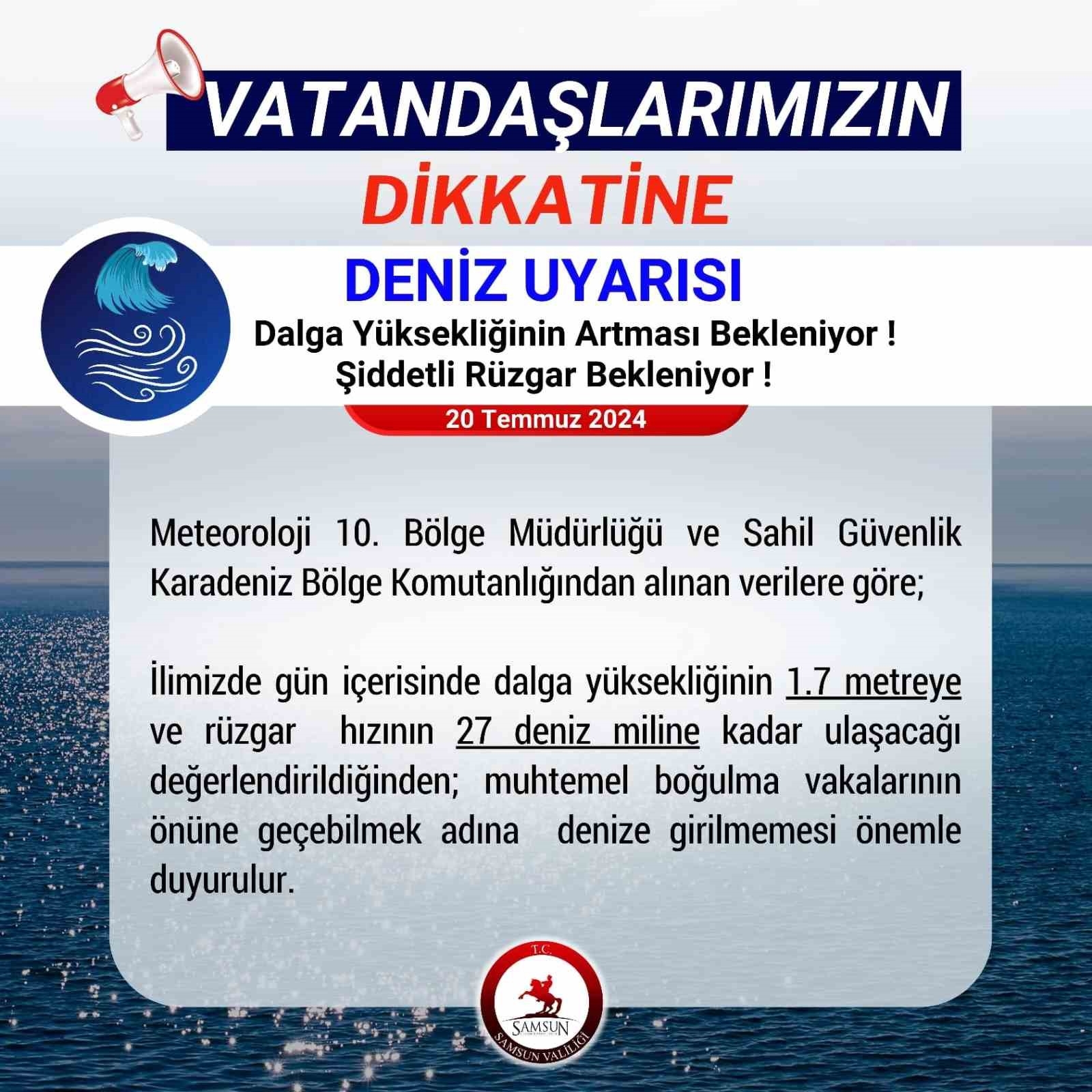 Samsun Valiliği ise şiddetli rüzgar ve dalga uyarısında bulunarak, "Meteoroloji 10. Bölge Müdürlüğü ve Sahil Güvenlik Karadeniz Bölge Komutanlığından alınan verilere göre ilimizde gün içerisinde dalga yüksekliğinin 1,7 metreye ve rüzgar hızının 27 deniz miline kadar ulaşacağı değerlendirildiğinden; muhtemel boğulma vakalarının önüne geçebilmek adına denize girilmemesi önemle duyurulur" ifadelerine yer verdi.