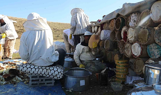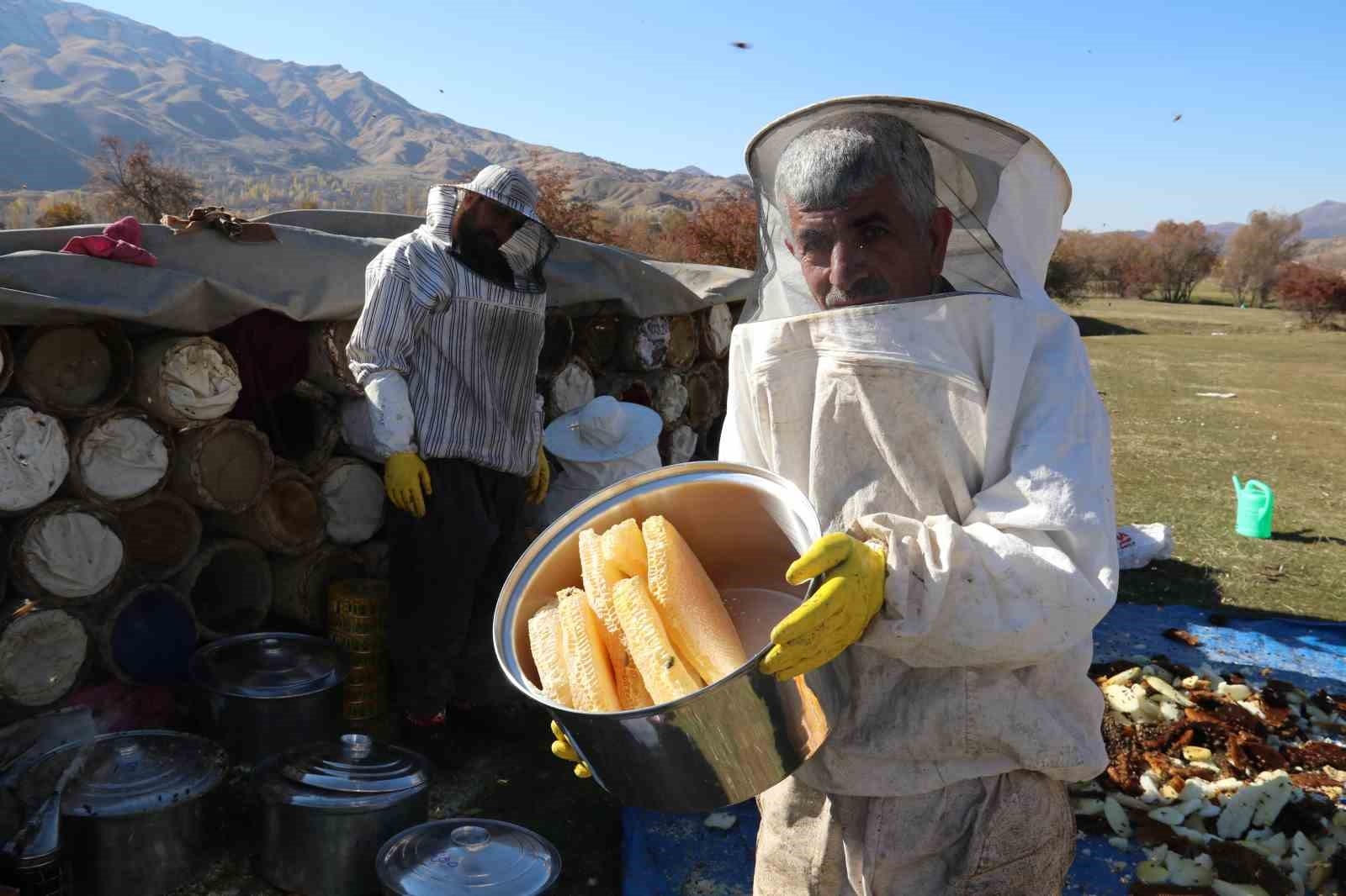 Bitlis'in Hizan ilçesinde ilkbahar mevsiminde yüksek bölgelere bırakılan kovanlarda katkı maddesi kullanılmadan üretilen karakovan balının hasadı devam ediyor.