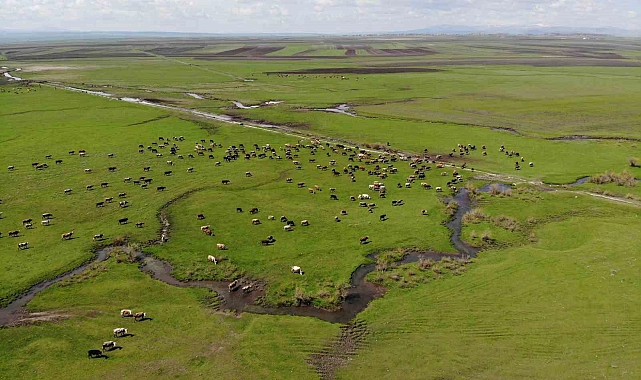 Güneşin sıcaklığını hissettiren bahar aylarıyla birlikte Kars'ın uçsuz bucaksız meraları yeşile büründü. Kuzu ve koyun seslerinin yankılandığı bu geniş otlaklar, havadan çekilen görüntülerle büyüleyici bir manzara oluşturdu.
