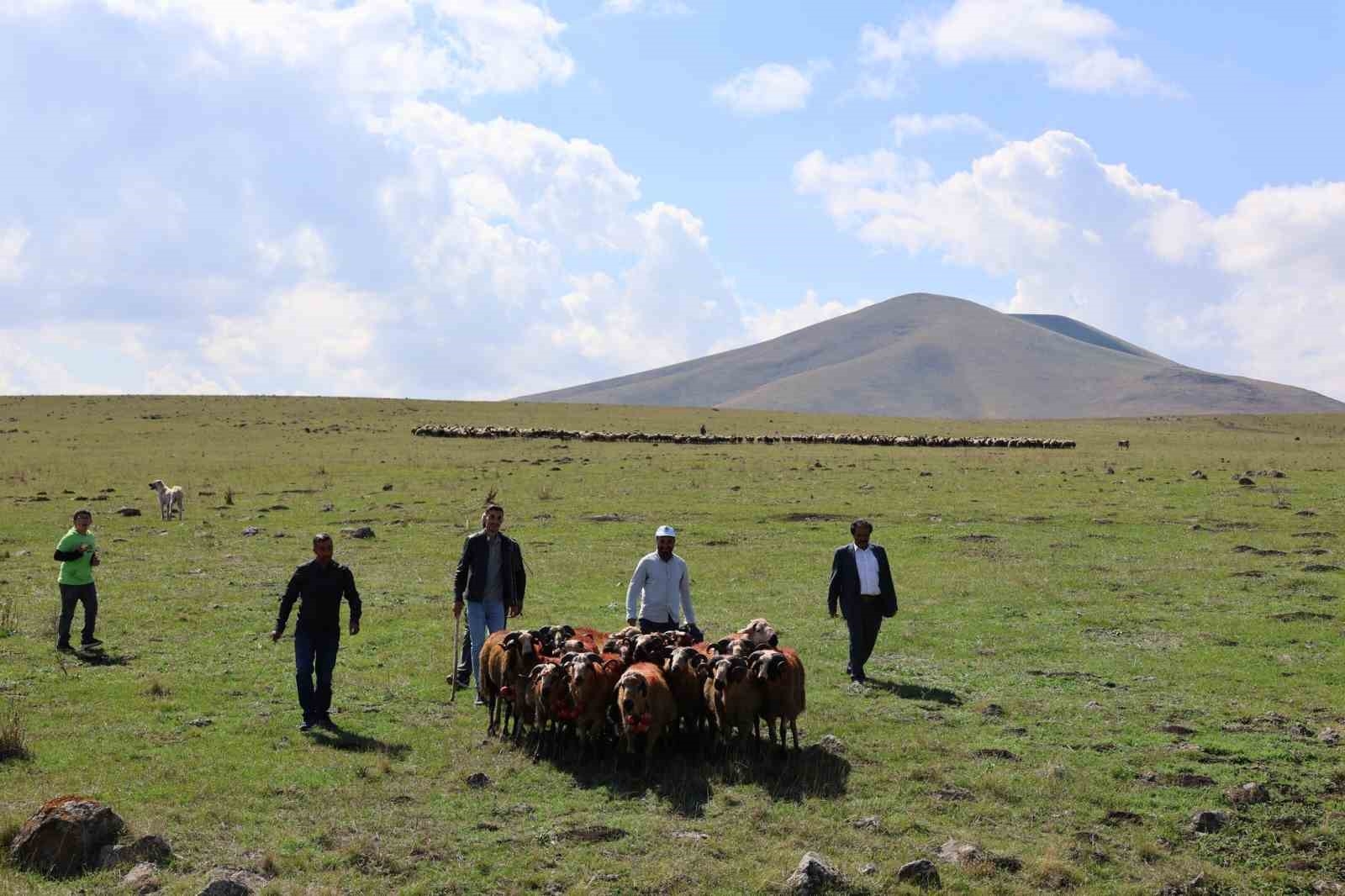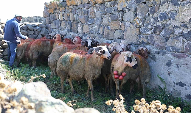 Kars'ta boyanan koçlar, boynuzlarına takılan elma ve şekerlemelerle sürüye katıldı.