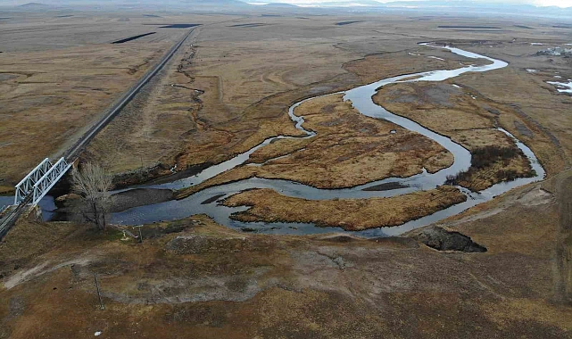 Allahu Ekber Dağları'ndan doğarak Selim ilçesinin köylerinden dolanarak geçen menderesler, doğanın sarı, turuncu ve kahverengi tonlarının suyla buluştuğu manzara dron ile havadan görüntülendi.