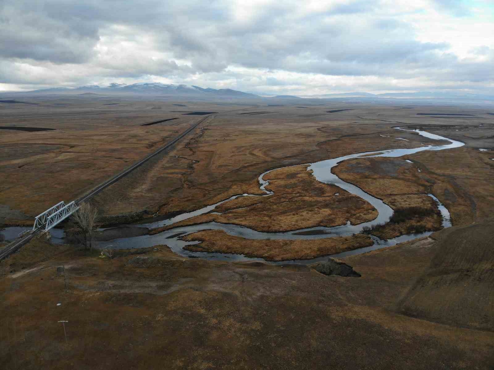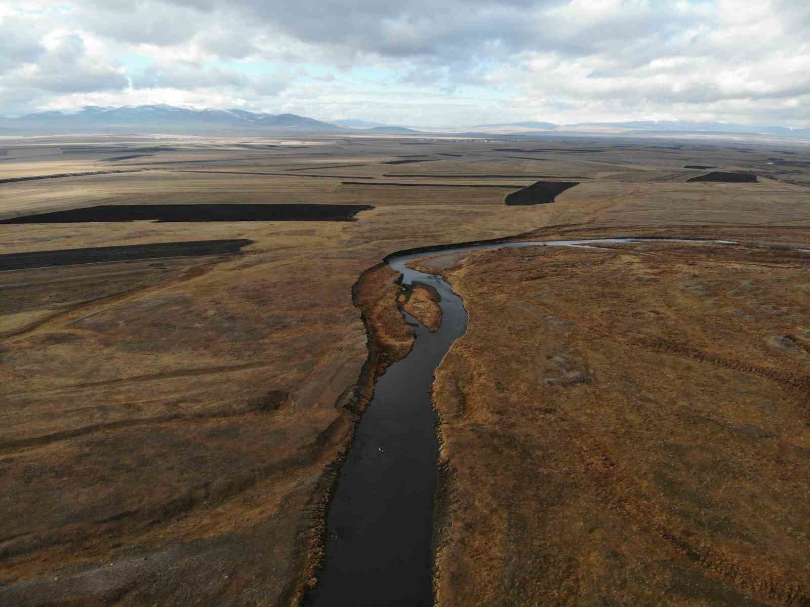 Allahu Ekber Dağları'ndan doğarak Selim ilçesinin köylerinden dolanarak geçen menderesler, doğanın sarı, turuncu ve kahverengi tonlarının suyla buluştuğu manzara dron ile havadan görüntülendi.