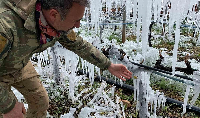 Kırıkkale'nin Delice ilçesinde hava sıcaklıklarının sıfırın altına düşmesiyle birlikte üzüm üreticisi Mehmet Erdem, bağlarını zirai don tehlikesine karşı sıra dışı bir yöntemle korumaya çalıştı. Erdem, üzüm bağlarını yağmurlama sistemiyle bilinçli olarak buzla kaplayarak soğuğun zararlı etkilerinden korumayı hedefledi.
