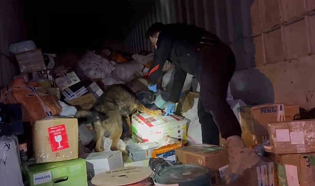 Kamyon içerisinde polis ekiplerince narkotik köpeği "Adam" ile arama yapıldı. Hassas burunlu narkotik köpeğinin tepki vermesi üzerine koliler incelendi.