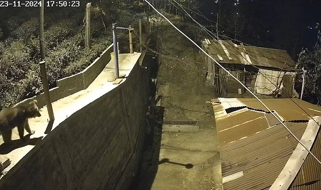 Merkeze bağlı Dörtyol köyünde kış uykusuna yatmayan ayı, 23 Kasım Cumartesi günü saat 17.58'de evlerin arka kısmında bulunan istinat duvarının üzerindeki yolda yürürken güvenlik kamerasına yakalandı. Görüntülerde evlerin olduğu bölgeye doğru duvarın üzerinde yürüyen ayının ilk önce duvarın sağ alt kısmında bulunan evleri kontrol ettiği görüldü. Sonrasında duvarın üzerindeki su dolu bidonu fark eden ayı, onunla oynamaya başladı. Bidonu devirince suyun hızlı bir şekilde aktığını gören ayı, korkarak duvarın sağ kısmında bulan çay tarım arazisine girerek hızlıca kaçtı. O anlar ise güvenlik kamerasına anbean yansıdı.