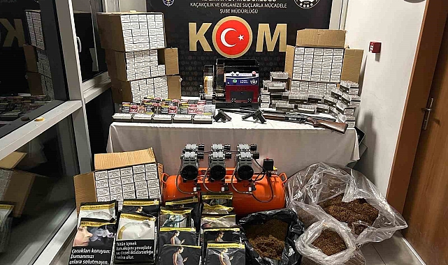Yapılan detaylı aramalarda, toplamda 81 bin 200 adet dolu ve boş makaron, 52 kilogram kaçak tütün, 2 adet makaron sarma makinesi, 1 adet hava kompresörü, 3 bin adet şeffaf sigara poşeti, 2 adet av tüfeği ve 2 adet kurusıkı tabanca bulundu.