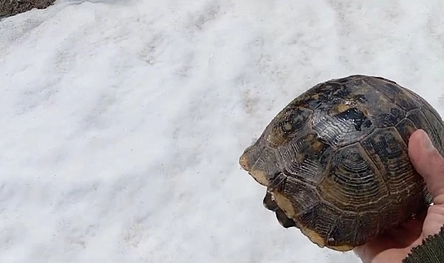 Hakkâri'nin Bağışlı köyünde yaşayan Davut Kaya isimli vatandaş, dağda mantar aradığı sırada, kar üzerinde sırt üstü mahsur kalan kaplumbağayı kurtardı.