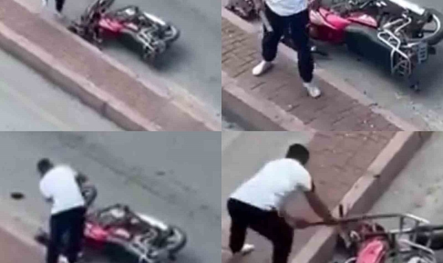 Trafik magandalığı anları, çevredeki vatandaşlar tarafından cep telefonu kameralarıyla kaydedildi. Görüntülerde, şahsın motosiklete zarar verdiği anlar net bir şekilde görülüyor.