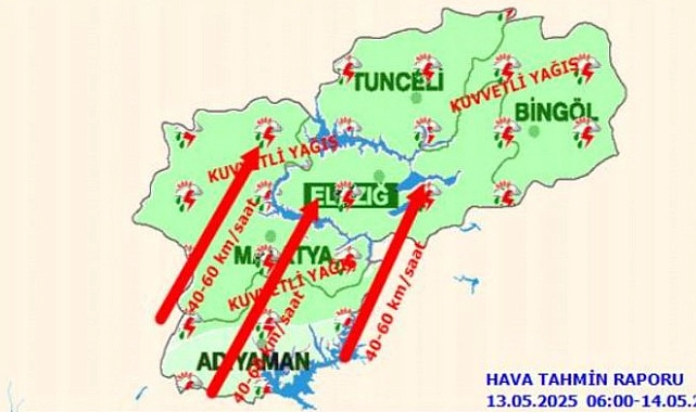 Meteoroloji 13. Bölge Müdürlüğü, Elazığ, Bingöl, Tunceli, Malatya ve Adıyaman illeri için kuvvetli sağanak ve gök gürültülü sağanak yağış uyarısında bulundu.