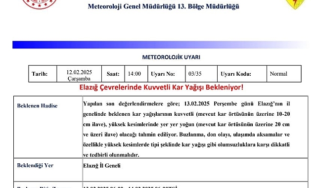 Meteoroloji 13. Bölge Müdürlüğü'nden yapılan açıklamada, "Yapılan son değerlendirmelere göre; 13.02.2025 Perşembe günü Elazığ'ın il genelinde beklenen kar yağışlarının kuvvetli (mevcut kar örtüsünün üzerine 10-20 cm ilave), yüksek kesimlerinde yer yer yoğun (mevcut kar örtüsünün üzerine 20 cm ve üzeri ilave) olacağı tahmin ediliyor. Buzlanma, don olayı, ulaşımda aksamalar ve özellikle yüksek kesimlerde tipi şeklinde kar yağışı gibi olumsuzluklara karşı dikkatli ve tedbirli olunmalıdır. Buzlanma ve don olayına bağlı ulaşımda aksamalar ve tipi gibi olumsuzluklara karşı dikkatli ve tedbirli olunması gerekmektedir. Oluşması muhtemel risklere karşı tedbirli ve dikkatli olunması gerekmektedir" denildi.
