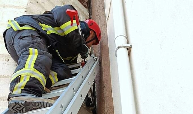 Manisa'nın Sarıgöl ilçesinde minare ile cami duvarı arasına sıkışan kedi, itfaiye ekiplerinin titiz çalışmasıyla kurtarıldı.